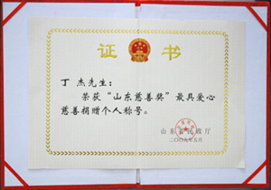 ·2009年,丁杰董事長獲得“山東慈善獎(jiǎng)”最具愛心慈善捐贈(zèng)個(gè)人稱號(hào)