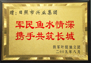 ·2009年8月,鐵軍獨(dú)立團(tuán)贈(zèng)日照興業(yè)集團(tuán)有限公司:軍民魚水情、攜手共筑長城
