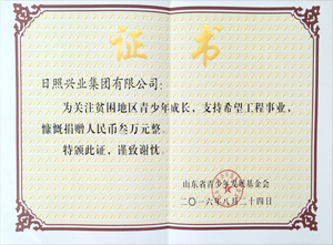 ·2016年8月24日,山東省青少年發(fā)展基金會(huì)為興業(yè)集團(tuán)頒發(fā)“關(guān)注貧困地區(qū)青少年成長(zhǎng),支持希望工程事業(yè),慷慨捐贈(zèng)人民幣3萬(wàn)元”榮獲證書(shū)。